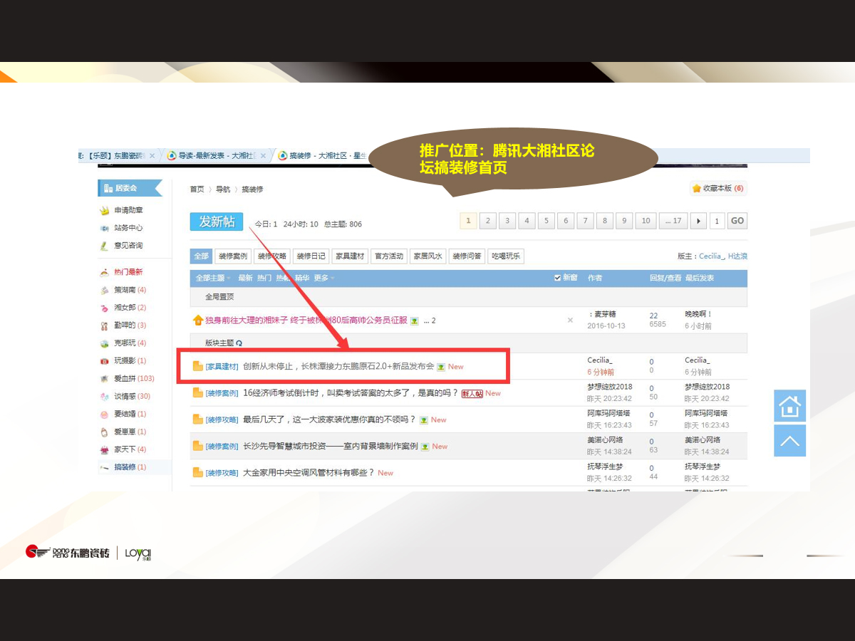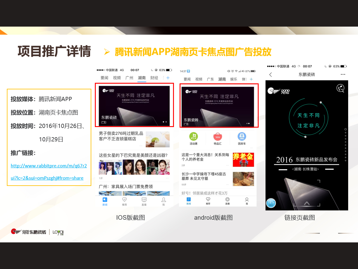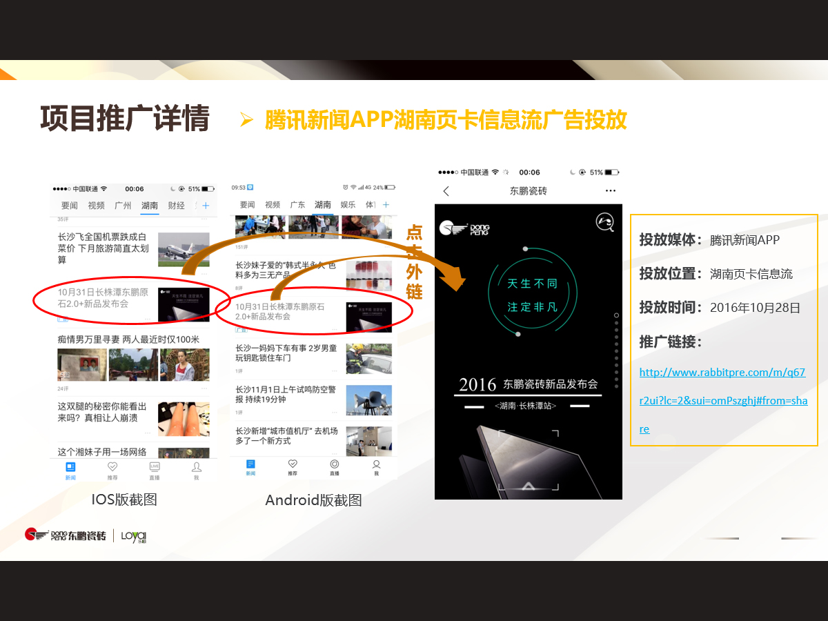 2016年10-11月,“东鹏瓷砖原石2.0+新品发布·湖南长株潭”新品发布会在湖南举办,乐颐助力将此发布会信息广而告之湖南区域人民,特别是让有装修需求的人群知晓,通过此次传播,扩大品牌影响力,提升品牌曝光度;从而辅助当地经销商促进销售。