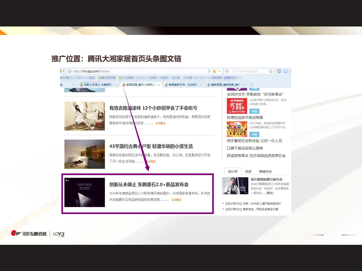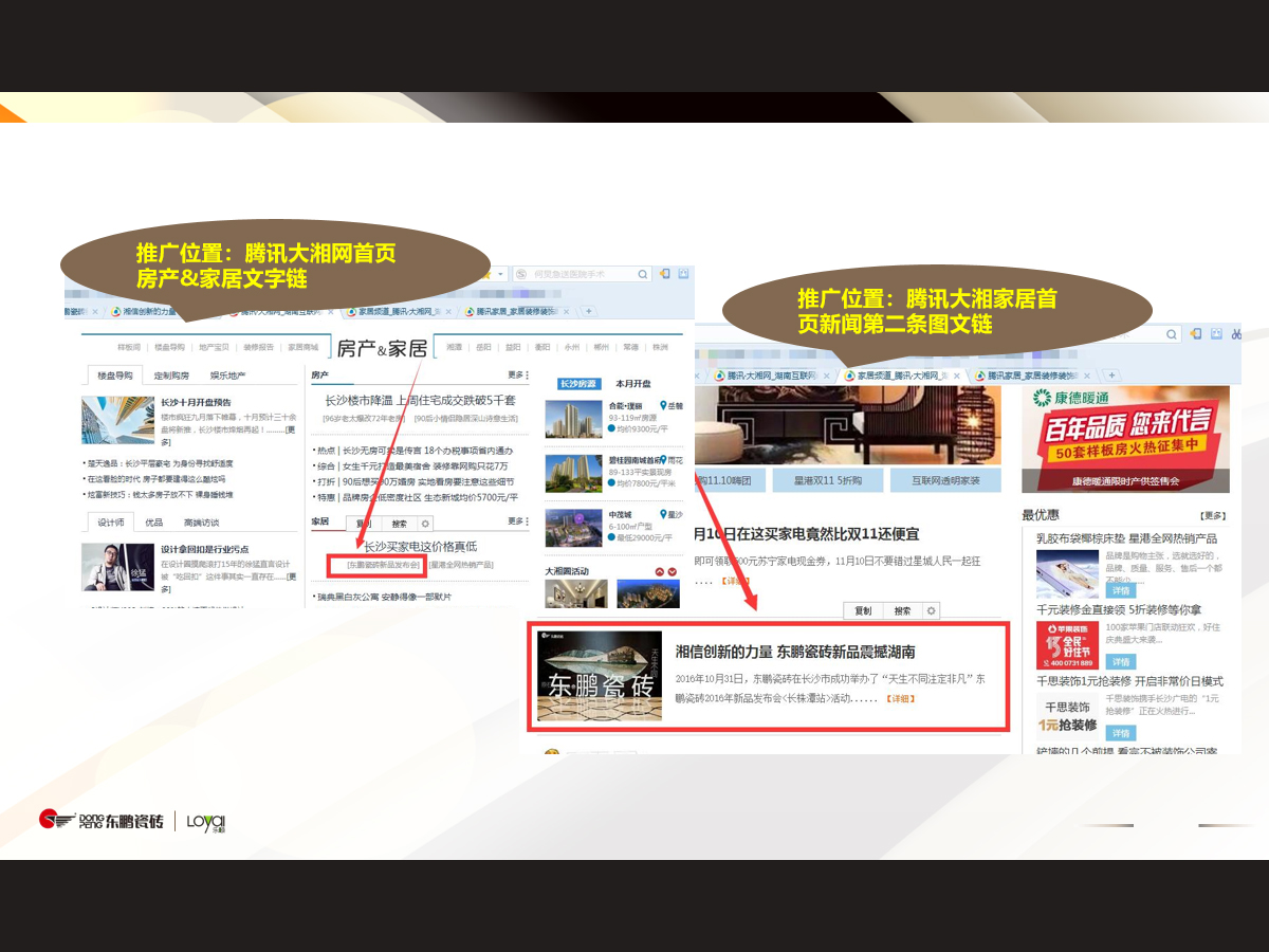 本次推广有焦点图、信息流、软文、H5等,焦点图位于最顶部黄金位置、视觉突出、自然呈现;信息流为原生广告,可融入阅读、浑然天成、高效触达、即时分享;软文以媒体角度撰写更能让消费者信赖,网页软文发布于多个位置并持续多天推广更能吸引消费者关注;H5的展示形式更清晰直观美观,具有动感,更易于被分享和传播。多种形式结合,相辅相成,达到最优展示效果。另外通过图文和文字链的形式,达到品效合一的效果,同时让东鹏瓷砖品牌达到最大程度的曝光。
