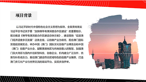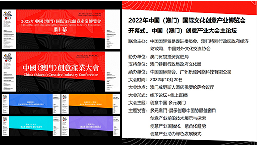 经国务院批准,为推动横琴粤澳深度合作区建设,促进澳门经济适度多元发展,由中国国际贸易促进委员会主办的首届中国(澳门)国际文化创意产业博览会于10月20日至22日在澳门威尼斯人酒店金光会展中心举办。